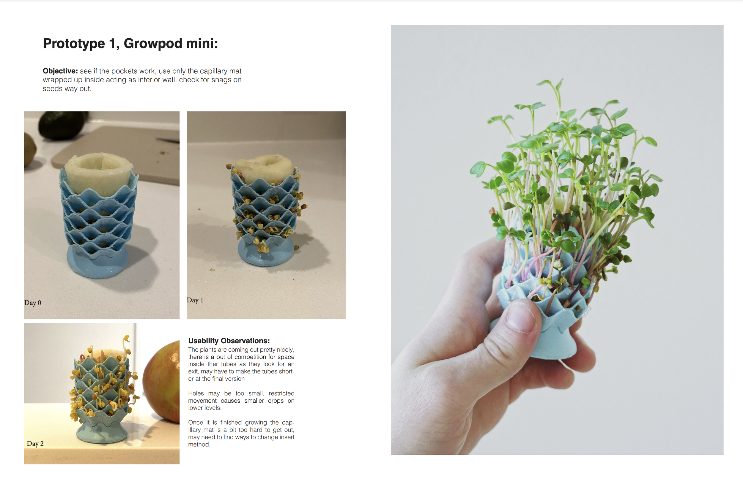 Growpod is a hydroponic desk lamp for growing microgreens. Built for home spaces, its unique shape is three times more efficient than a standard flat growing plot of the same countertop area. Diagonal pockets line all sides of the 3d printed horseshoe shaped pod, and provide one unbroken ribbon of planting space. Lining the inside of the pod, capillary mats draw water up to all levels of plants evenly. The grow lamp in the center of the Growpod helps the darker interior surface grow, while ambient light from a window will tend to the outer layer. Growpod takes a week to produce a full Tupperware of microgreens ranging in anything from radishes to broccoli to kale or peas. Pods are stackable on the wooden base making the platform scalable to any size of home growing operation.